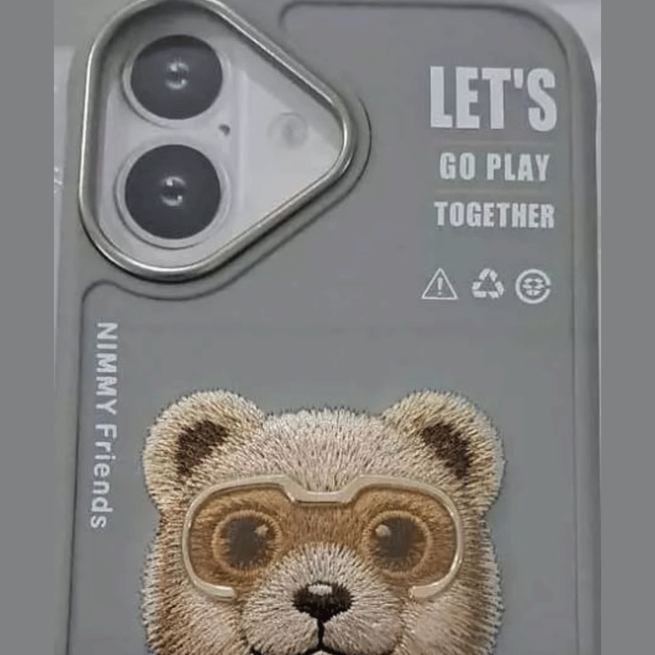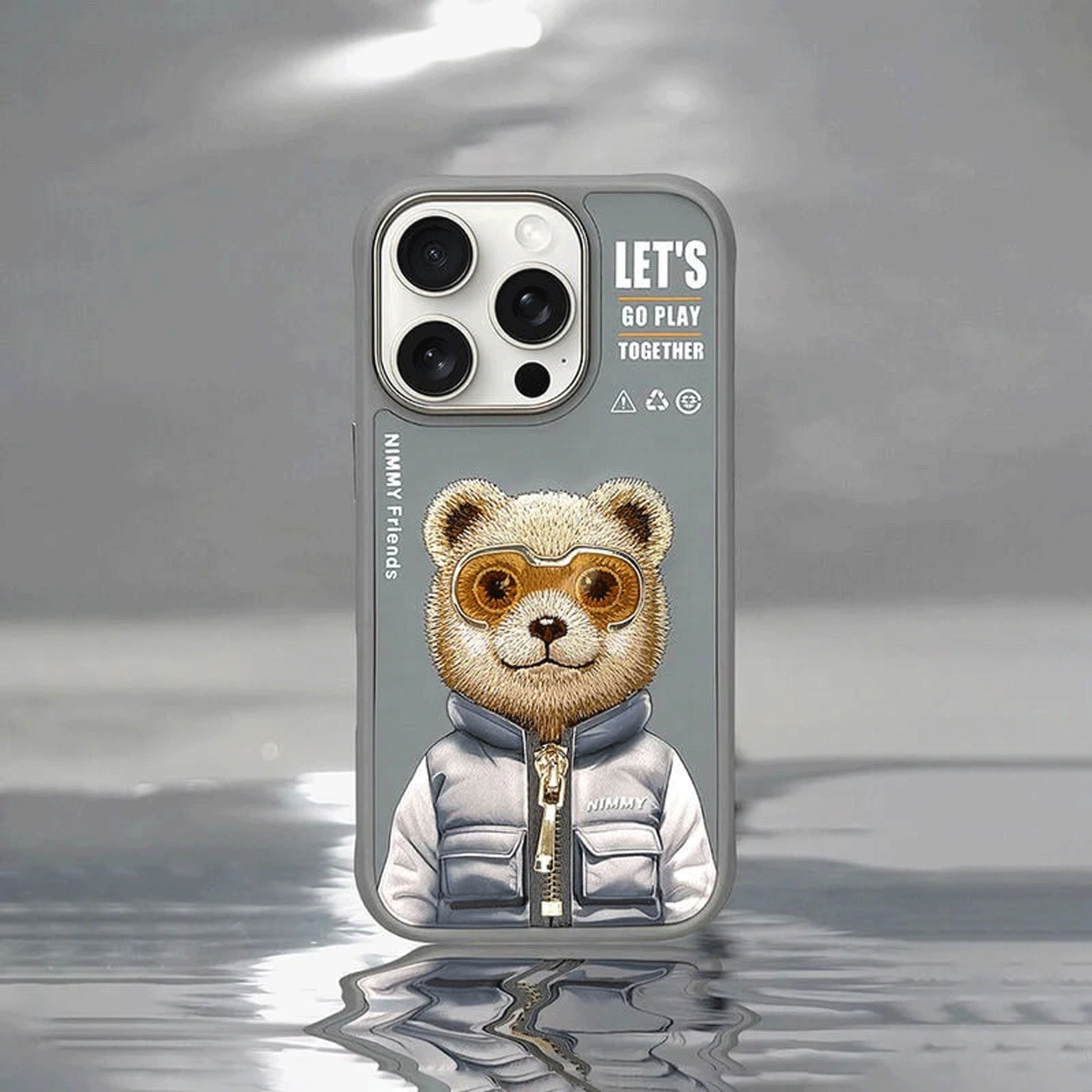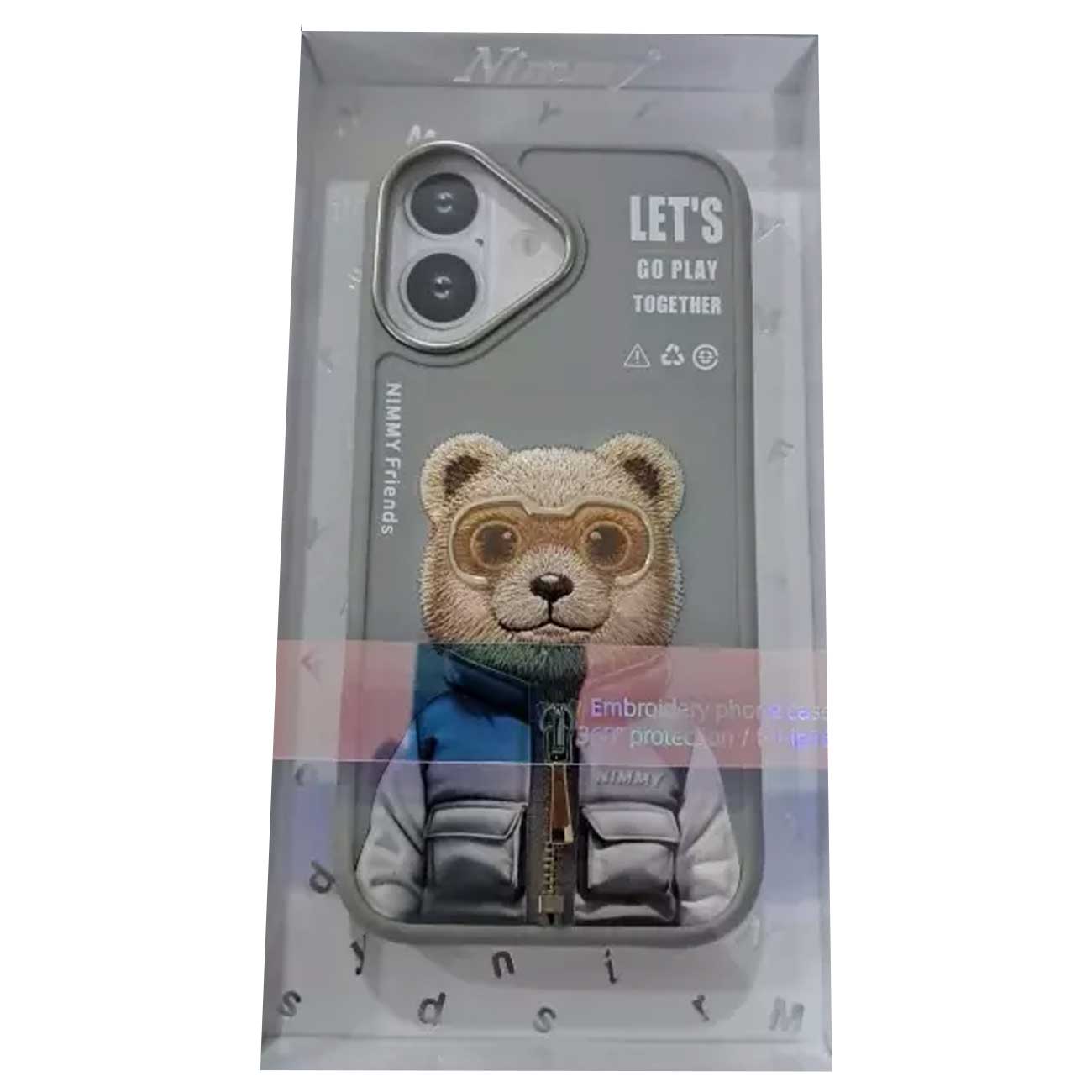 قاب محافظ گوشی آیفون 16 طرح خرس با عینک و زیپ واقعی نیمی Embroidery