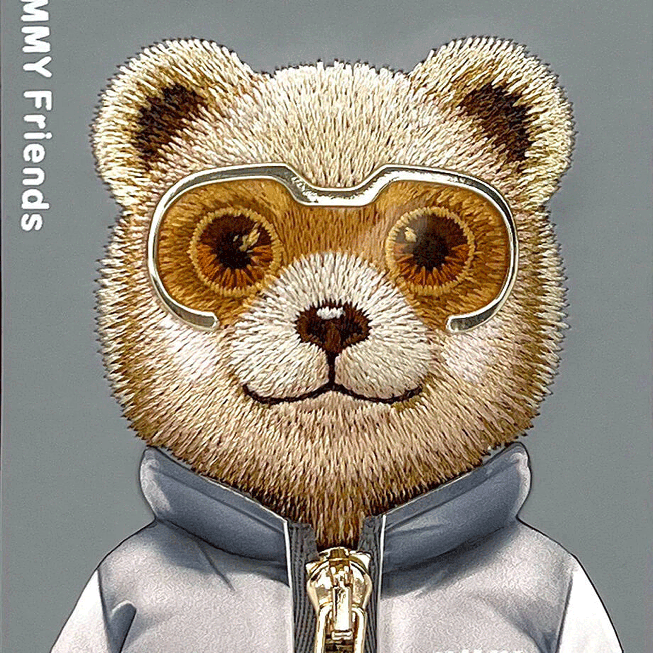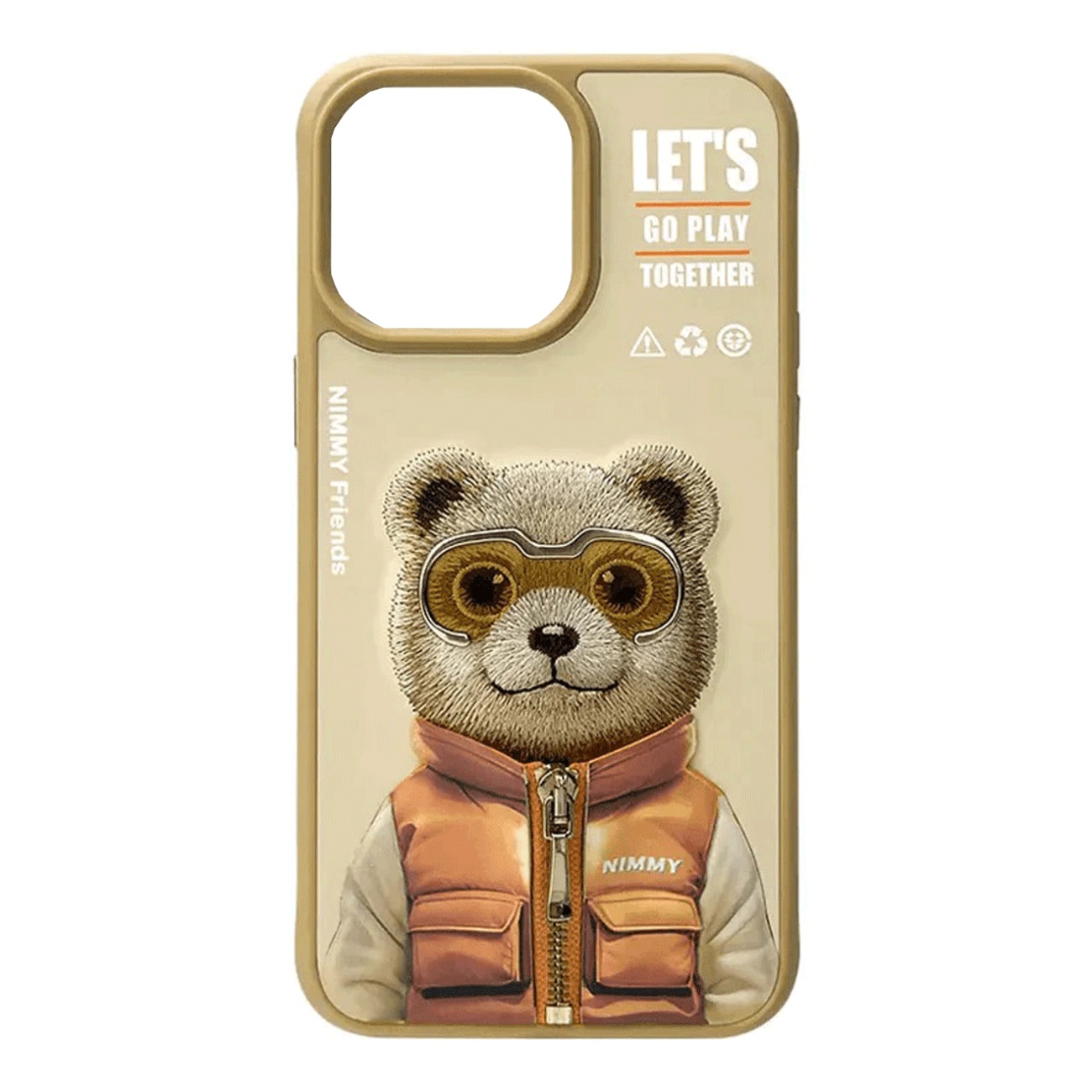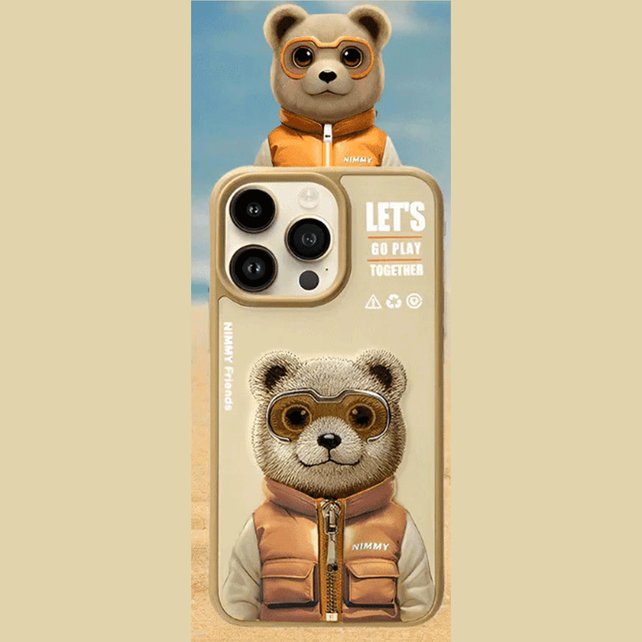 قاب محافظ گوشی آیفون 16 طرح خرس با عینک و زیپ واقعی نیمی Embroidery