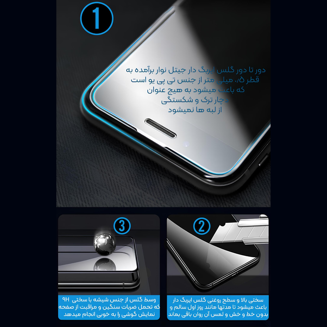 | سایر ویژگیها | - گلس ایربگ دار 5 بعدی - مقاوم در برابر شکستن و ترک خوردن - امکان استفاده از گوشی بدون قاب - آبگریز، ضدلک و اثر انگشت - پوشش کامل صفحه نمایش - شفافیت بالا HD - لمس بسیار روان و سریع - تمام چسب، نصب آسان |
