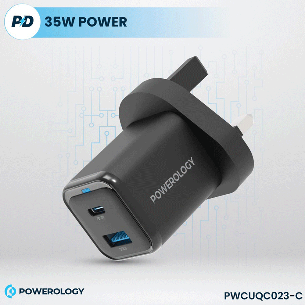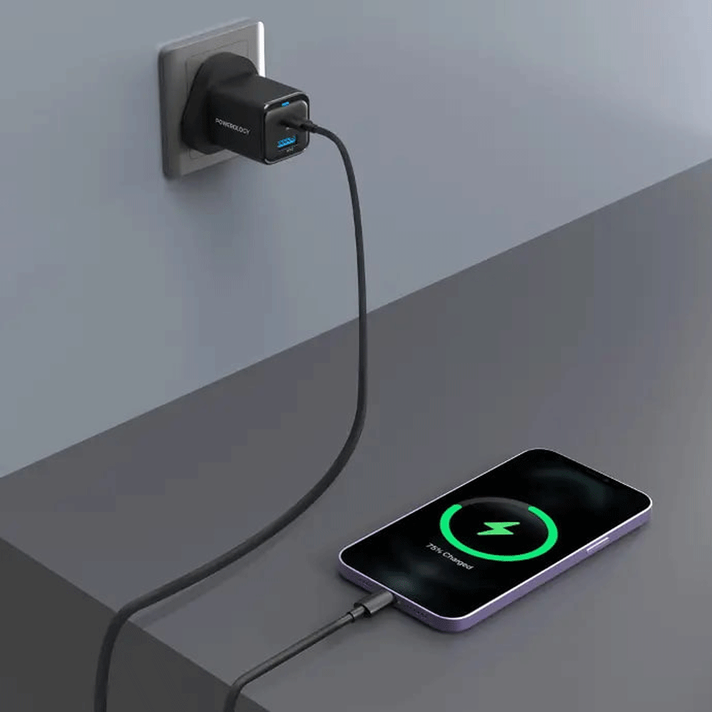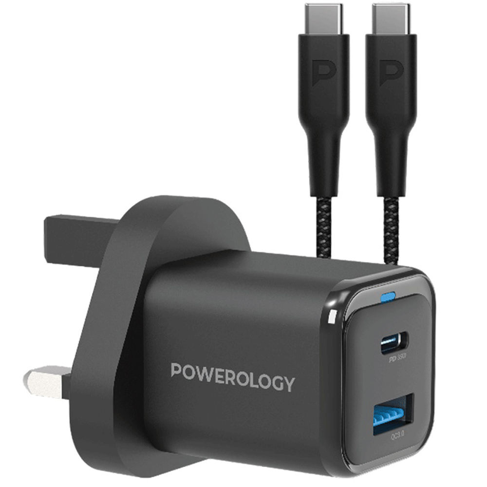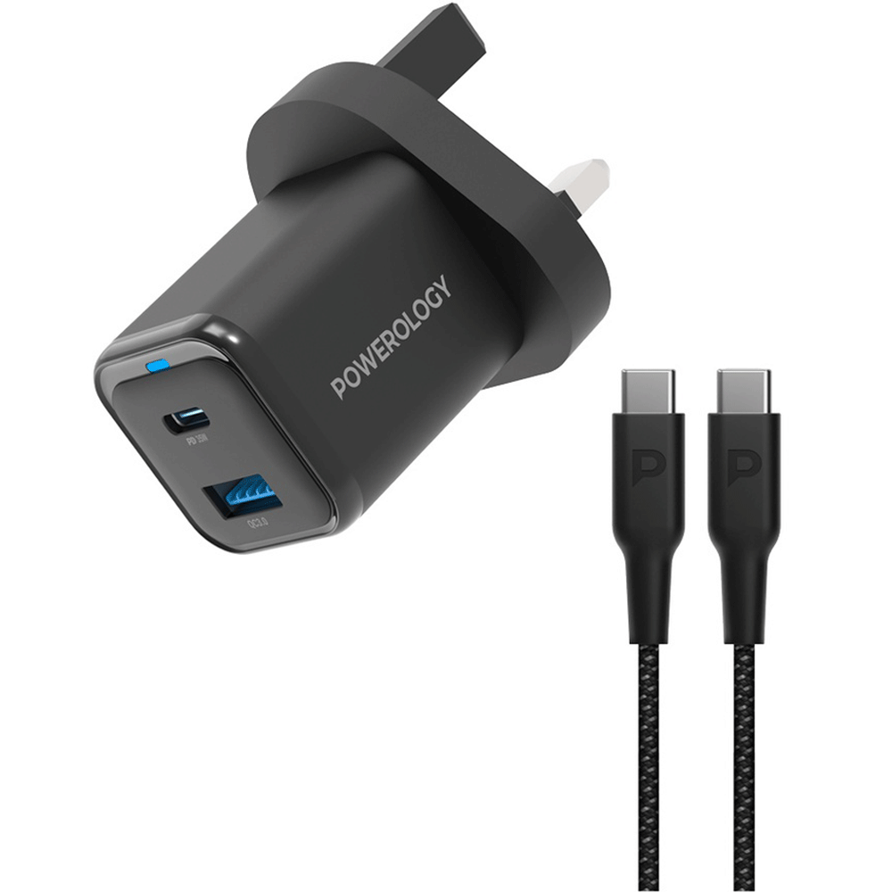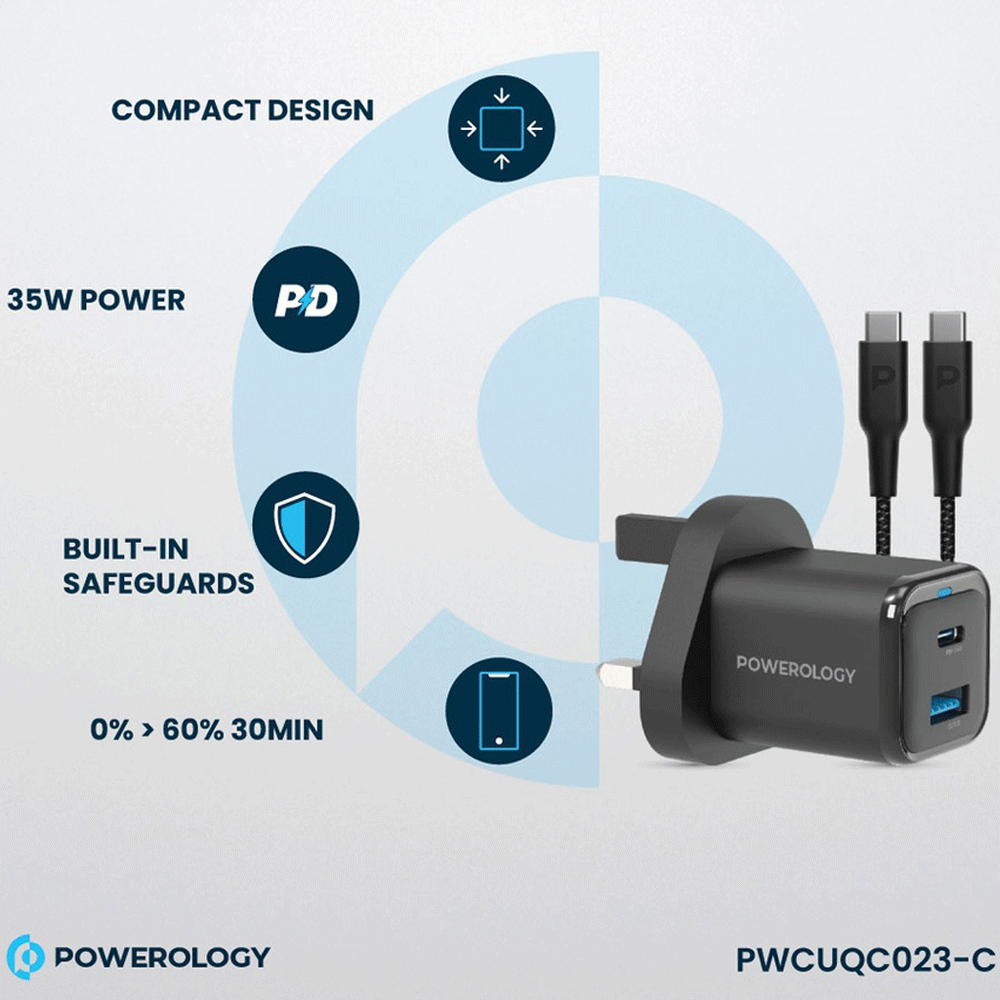 Powerology PWCUQC023-C 1xUSB-C 35W / 1xUSB-A 18W GaN Charger with Type C to C 60W