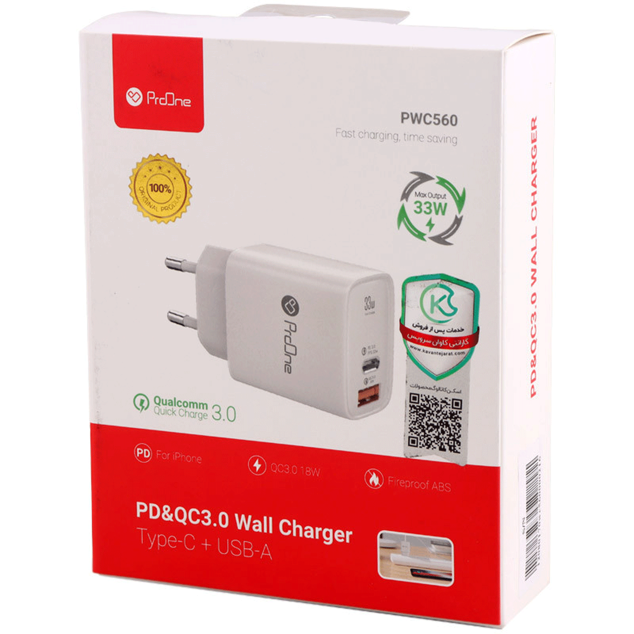 شارژر دیواری تایپ سی و یو اس بی 33 وات پرووان PWC560