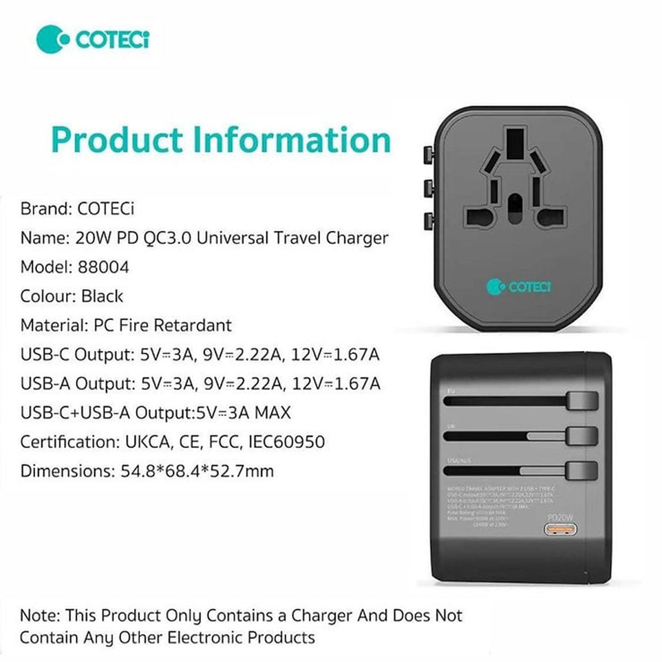 Coteetci 20W PD OC3.0 UniversalTravel Charger 88004
