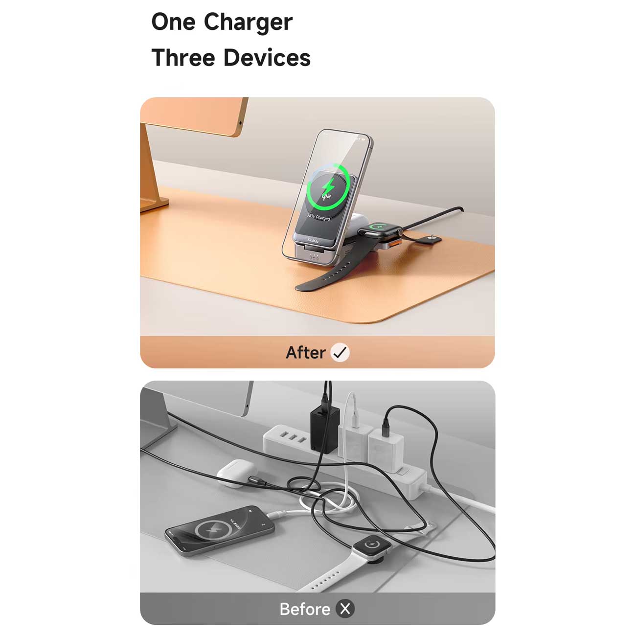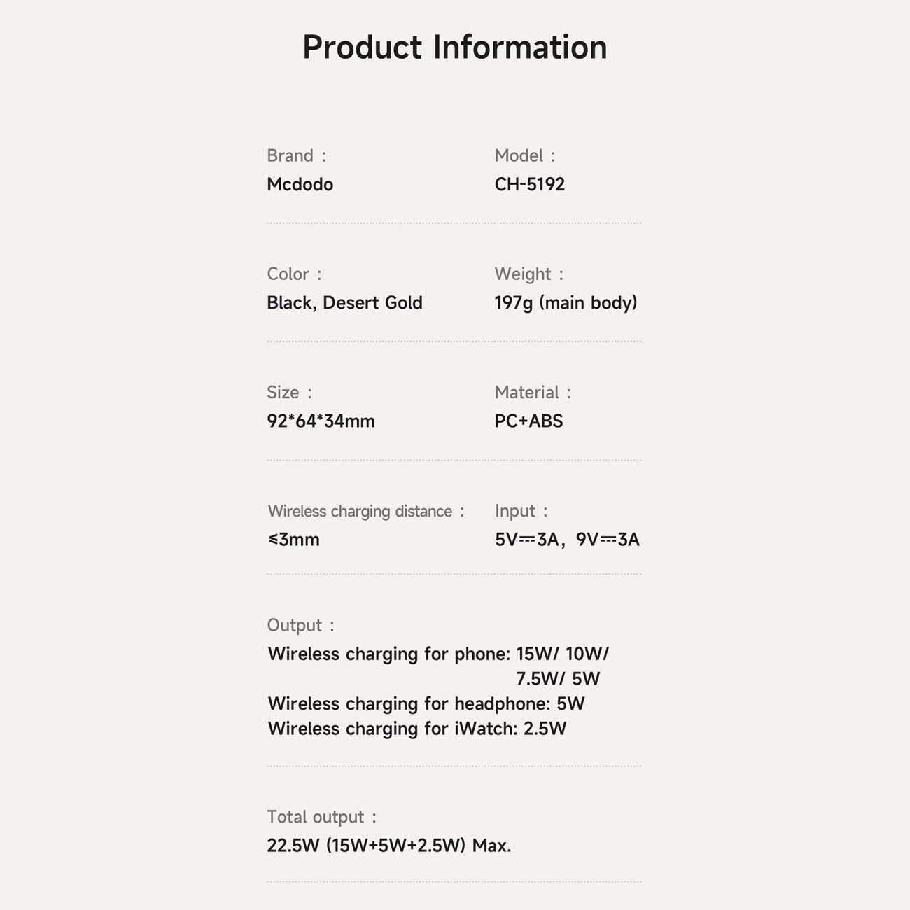 | توان خروجی | گوشی: 15W/ 10W/ 7.5W/5W,ایرپاد: 5W,اپلواچ: 2.5W,حداکثر توان: 22.5W (15W+5W+2.5W) |