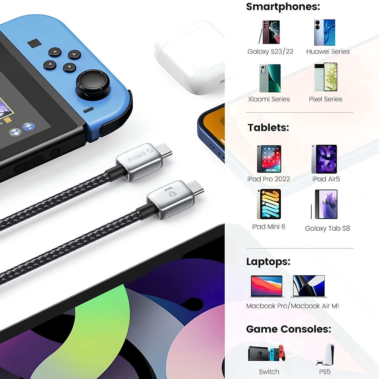 ORICO-GQZB100-10-BK-BP Fast Charging Cable USB-C to USB-C 100W 1M