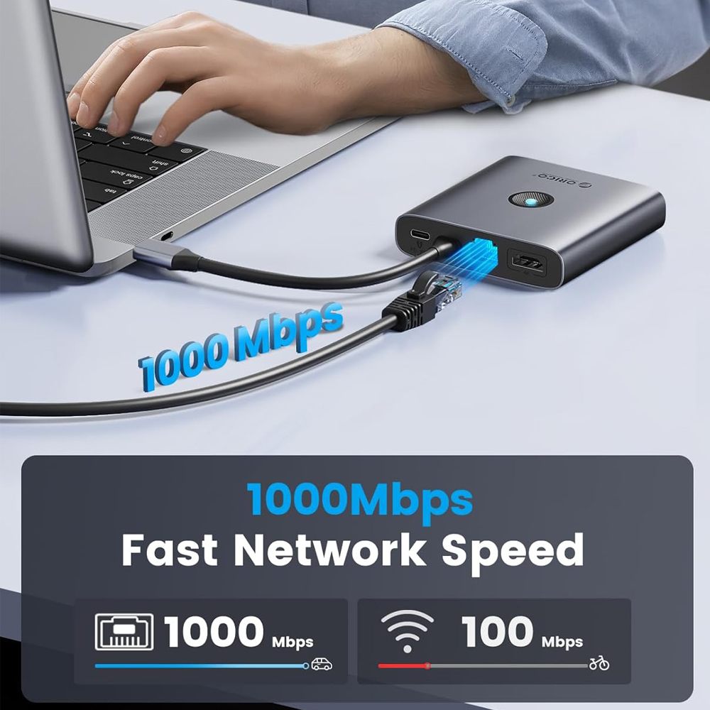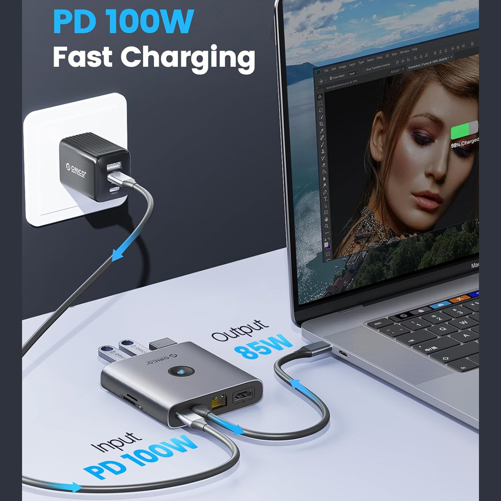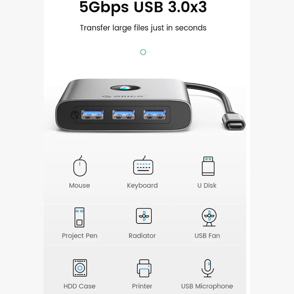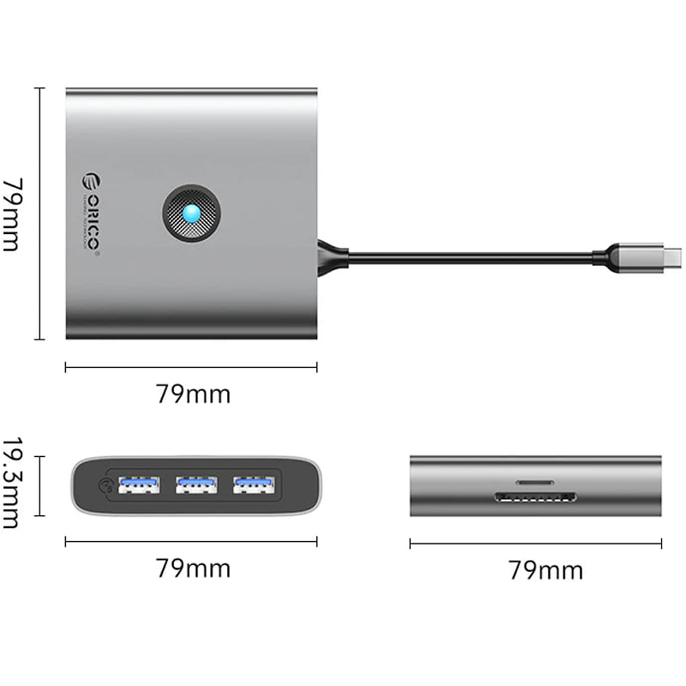 Adaptador USB-C a 3USB 3.0/HDMI 4K/3.5mm/PD/RJ45 8 in 1 Orico FAX3-8PM-GY-EP