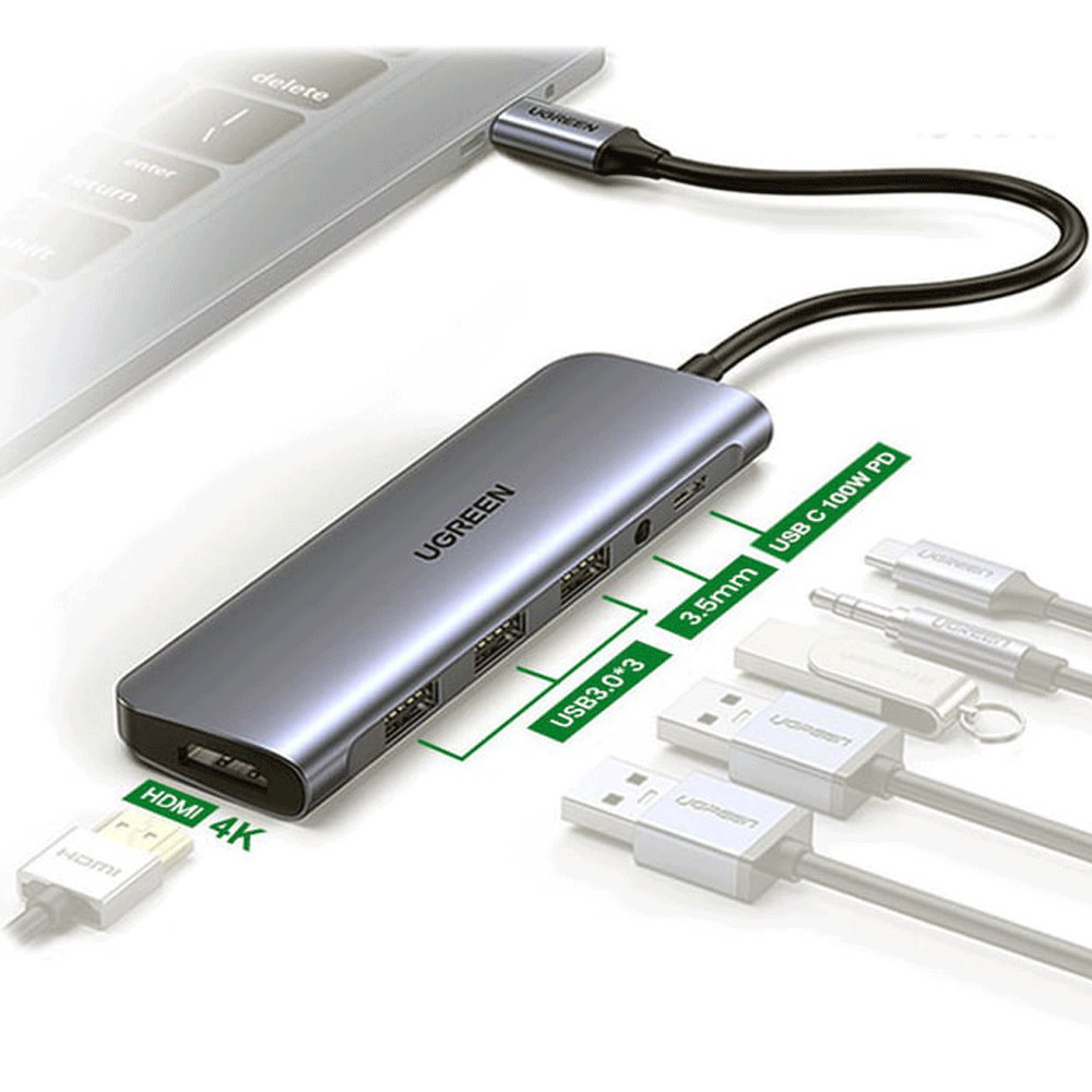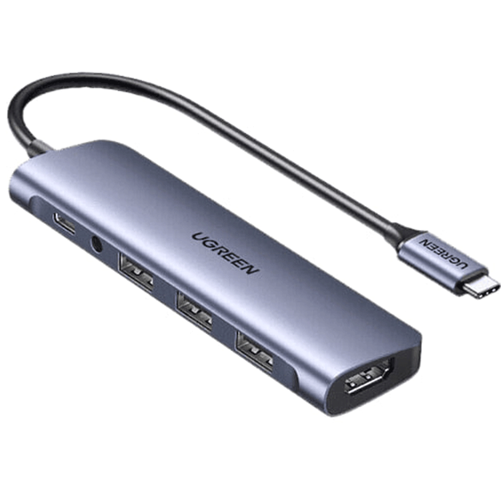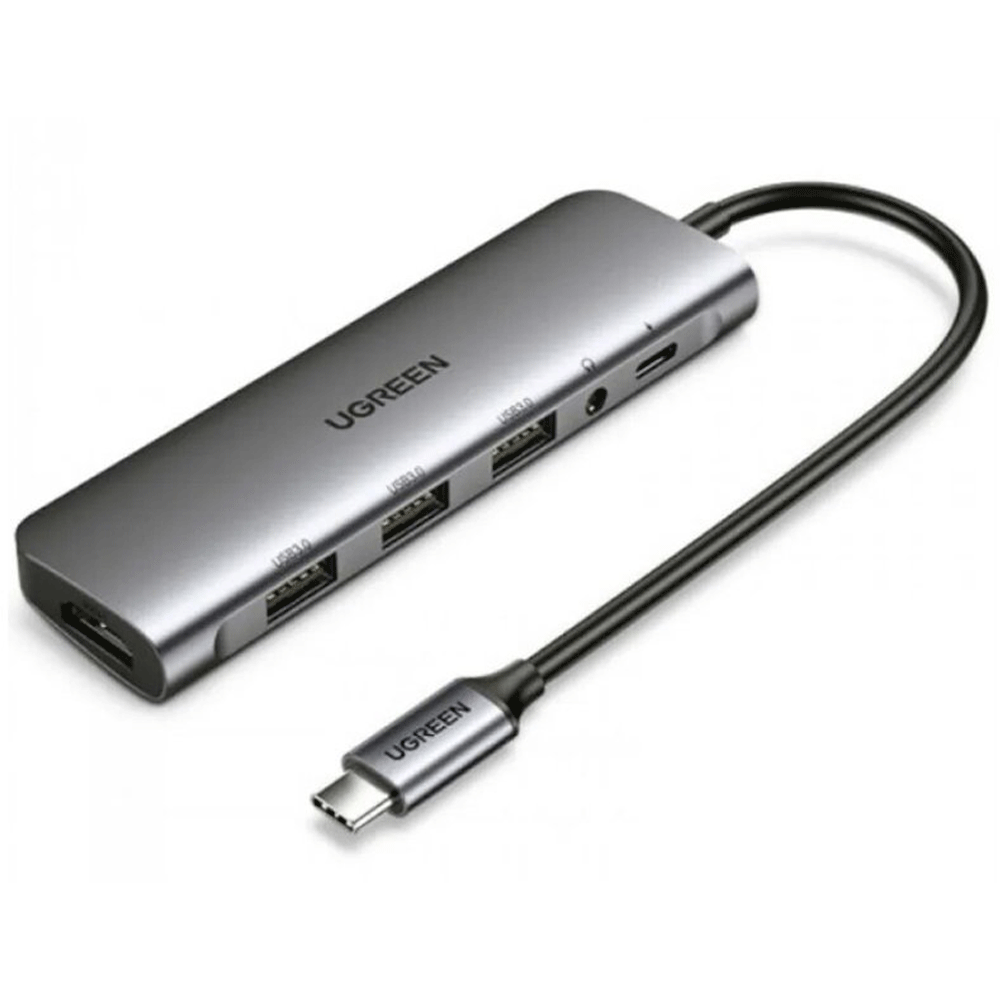 Adapter UGreen CM136 (80132) USB C to 3×USB 3.0+HDMI+3.5mm (2-in-1)+PD Adapter gray