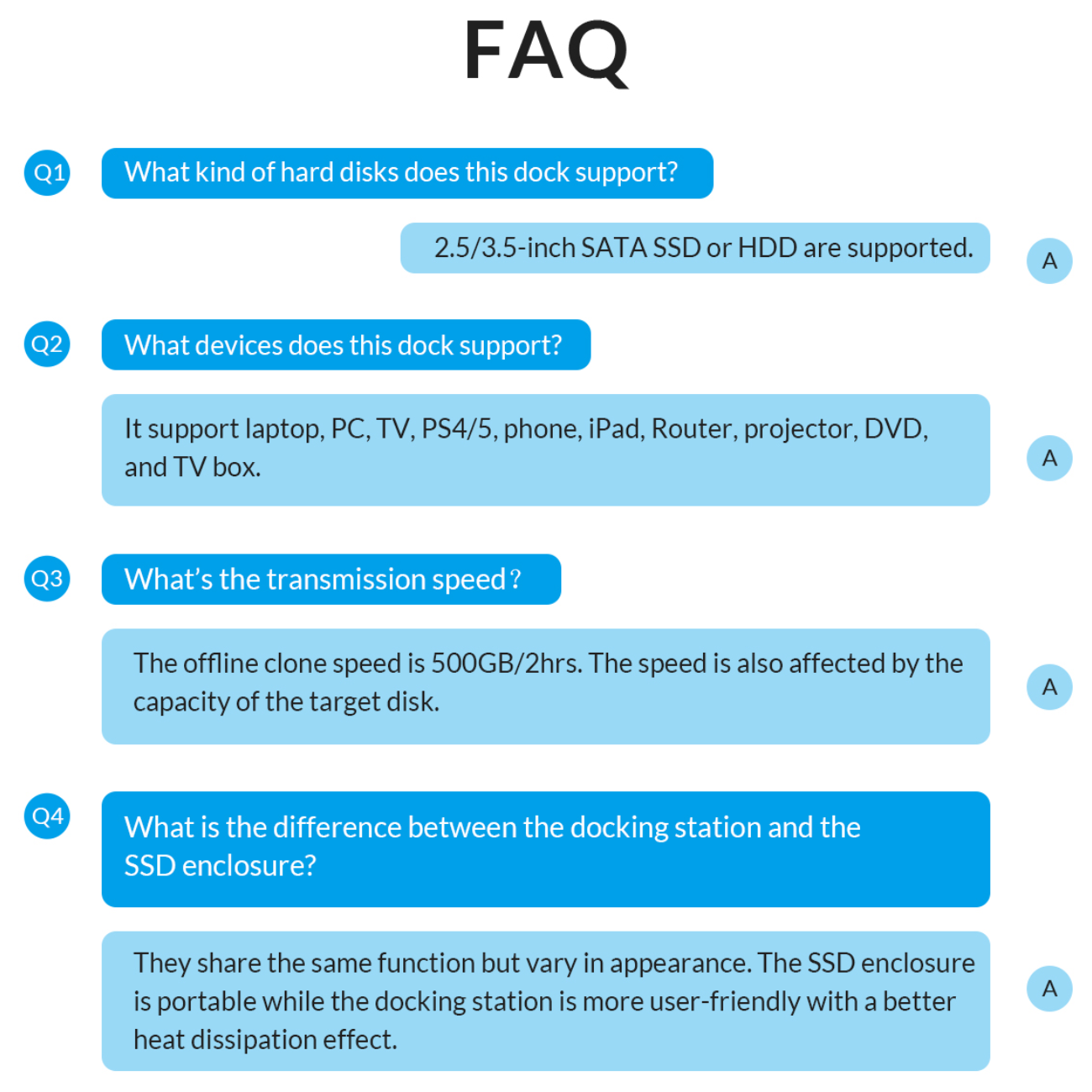 | سایر ویژگیها | - قابلیت پشتیبانی از کلون گرفتن آفلاین - محافظت در برابر ولتاژ، اتصال کوتاه و گرما - پشتیبانی از پروتکل UASP، طراحی ضد گرد و غبار، نصب بدون نیاز به ابزار - پشتیبانی از دیسکها: 2.5 اینچ + 2.5 اینچ، 2.5 اینچ + 3.5 اینچ، 3.5 اینچ + 3.5 اینچ |