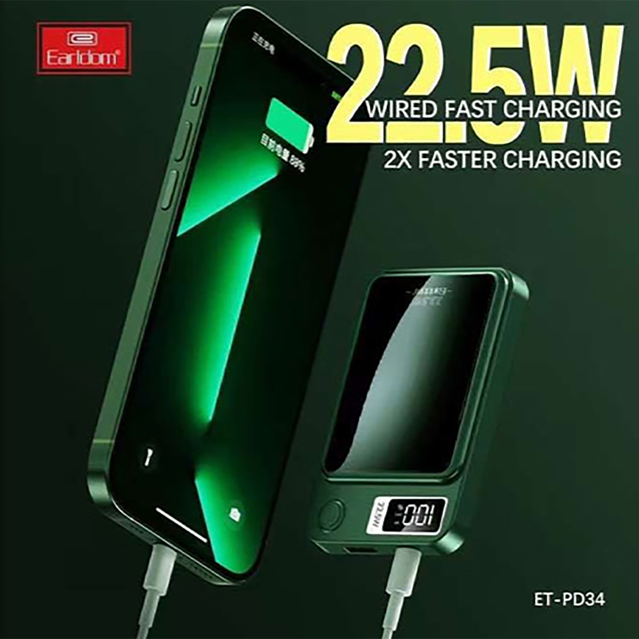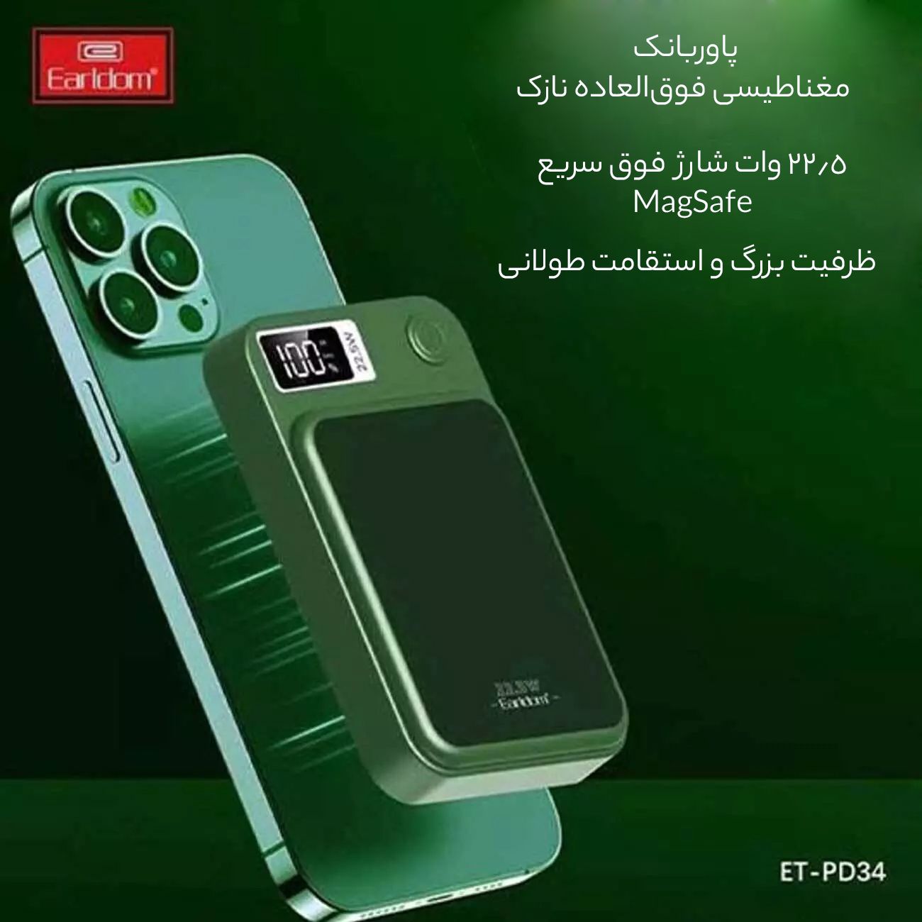 پاوربانک فست شارژ مگنتی 15 وات، یو اس بی و تایپ سی 22.5 وات 10000 ارلدام ET-PD34