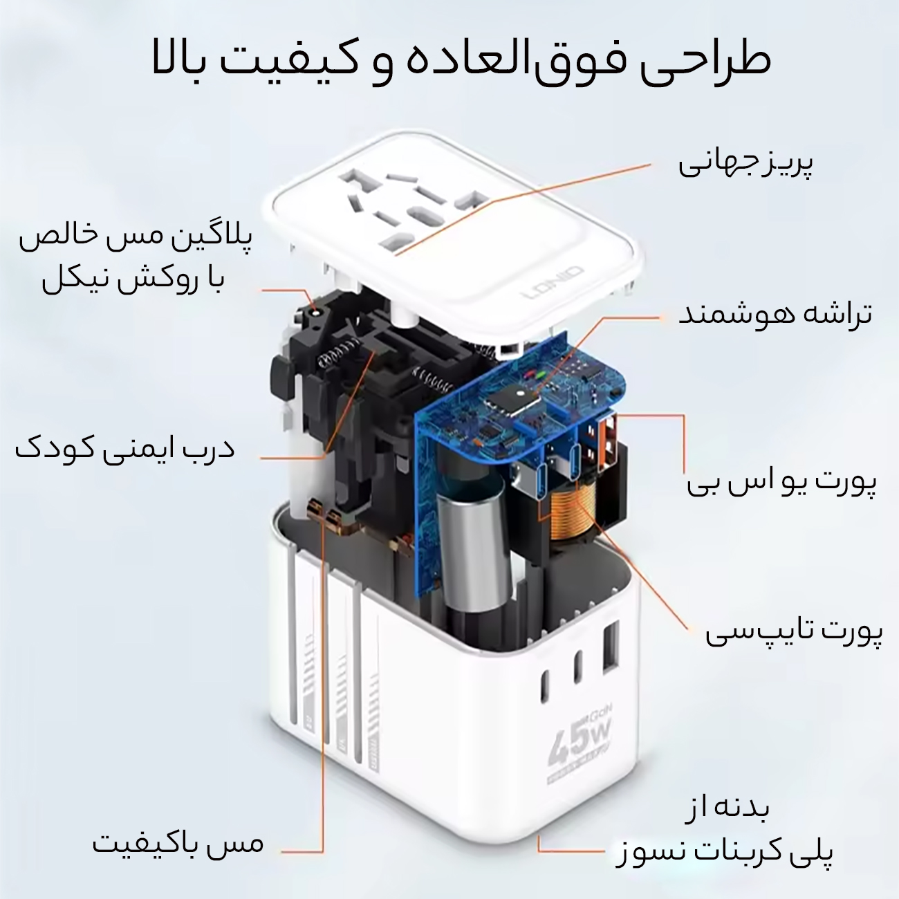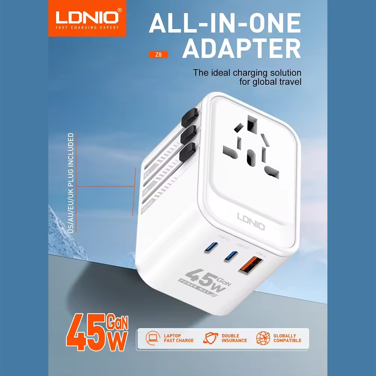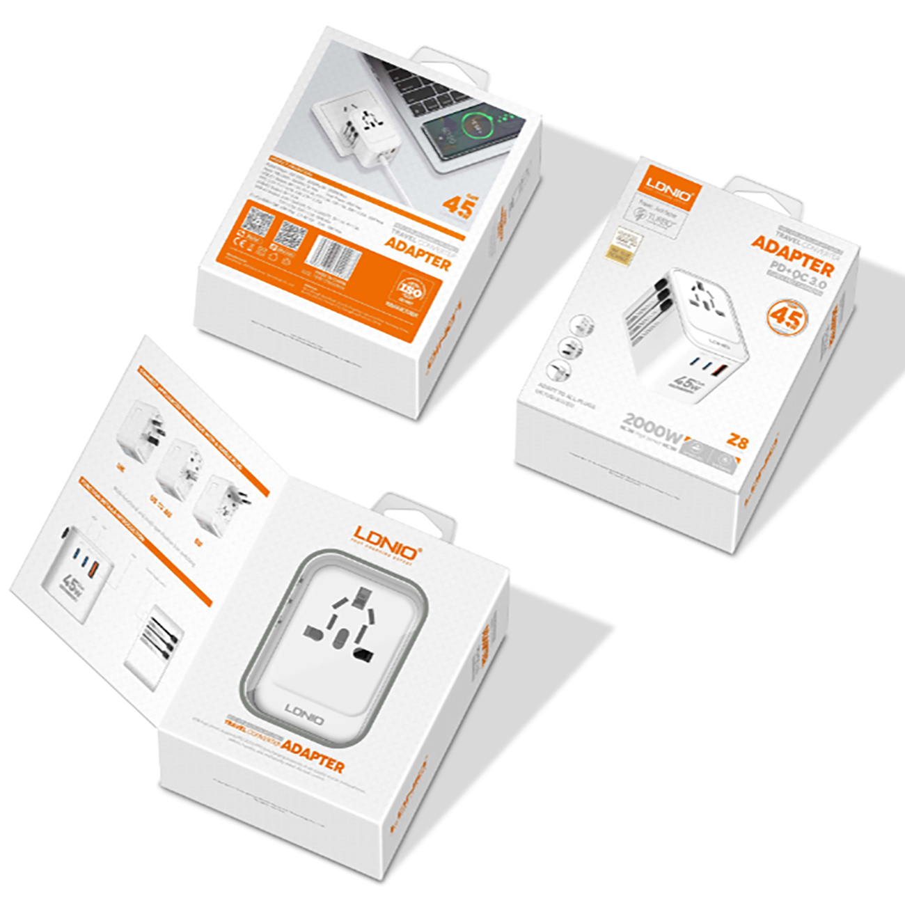 چندراهی برق 45 یک یو اس بی، دو تایپ سی و یک سوکت برق با دوشاخههای مختلف الدنیو Z8