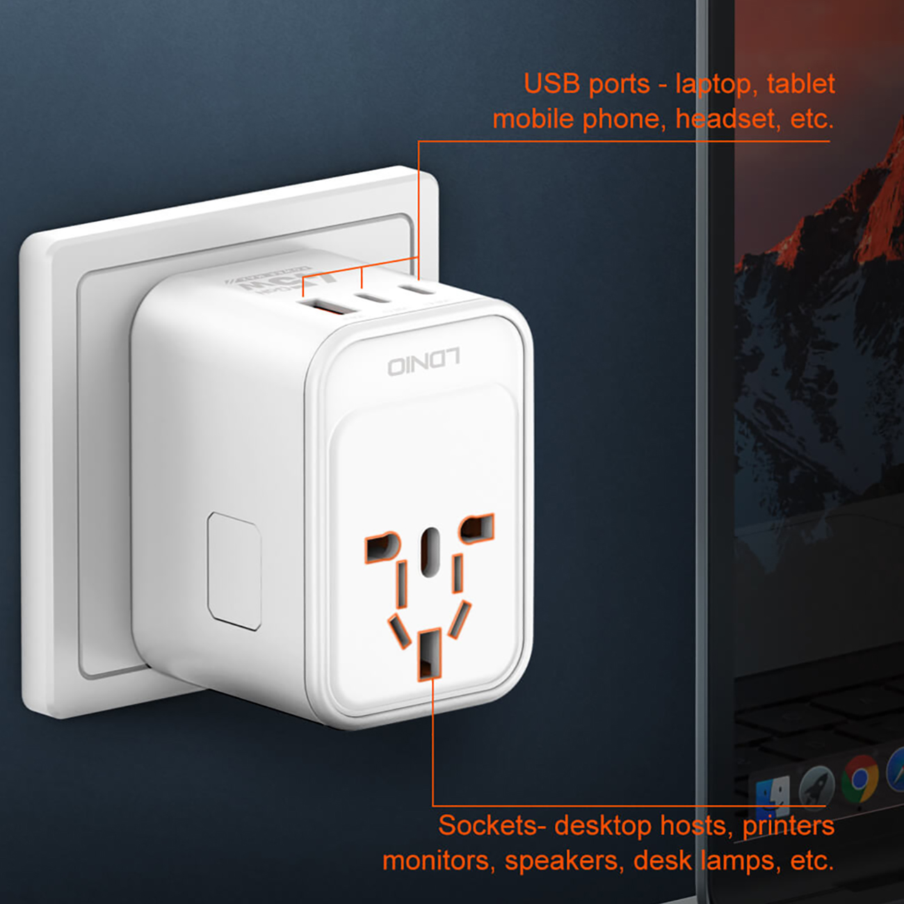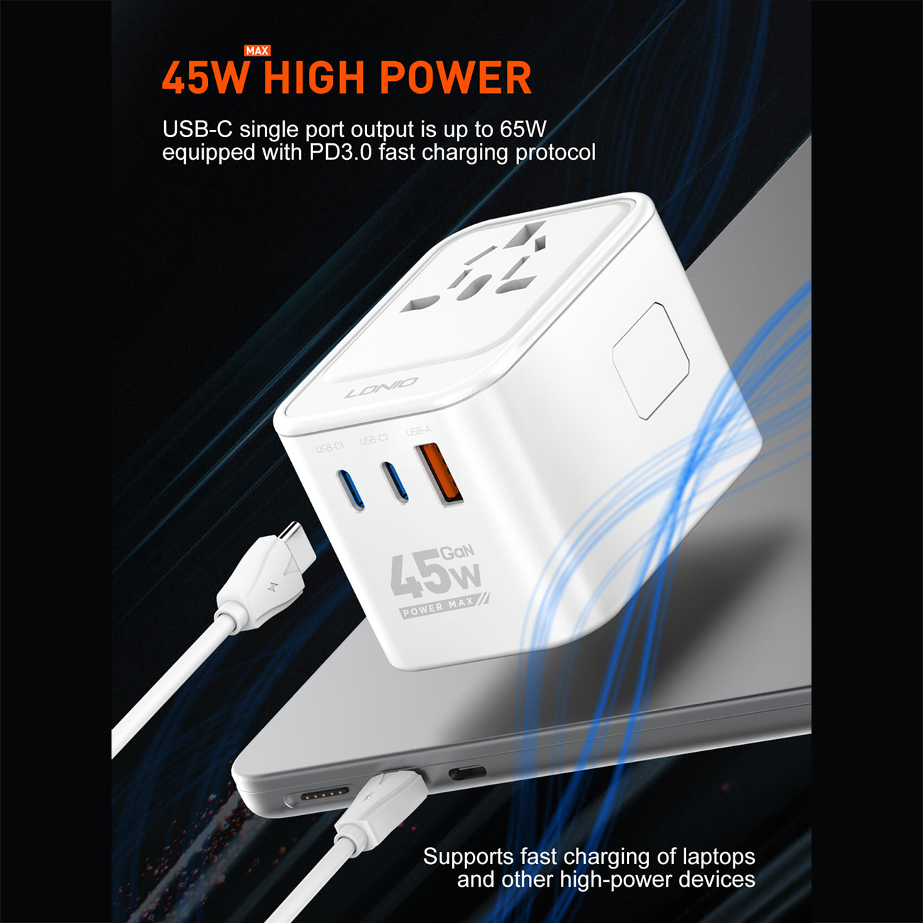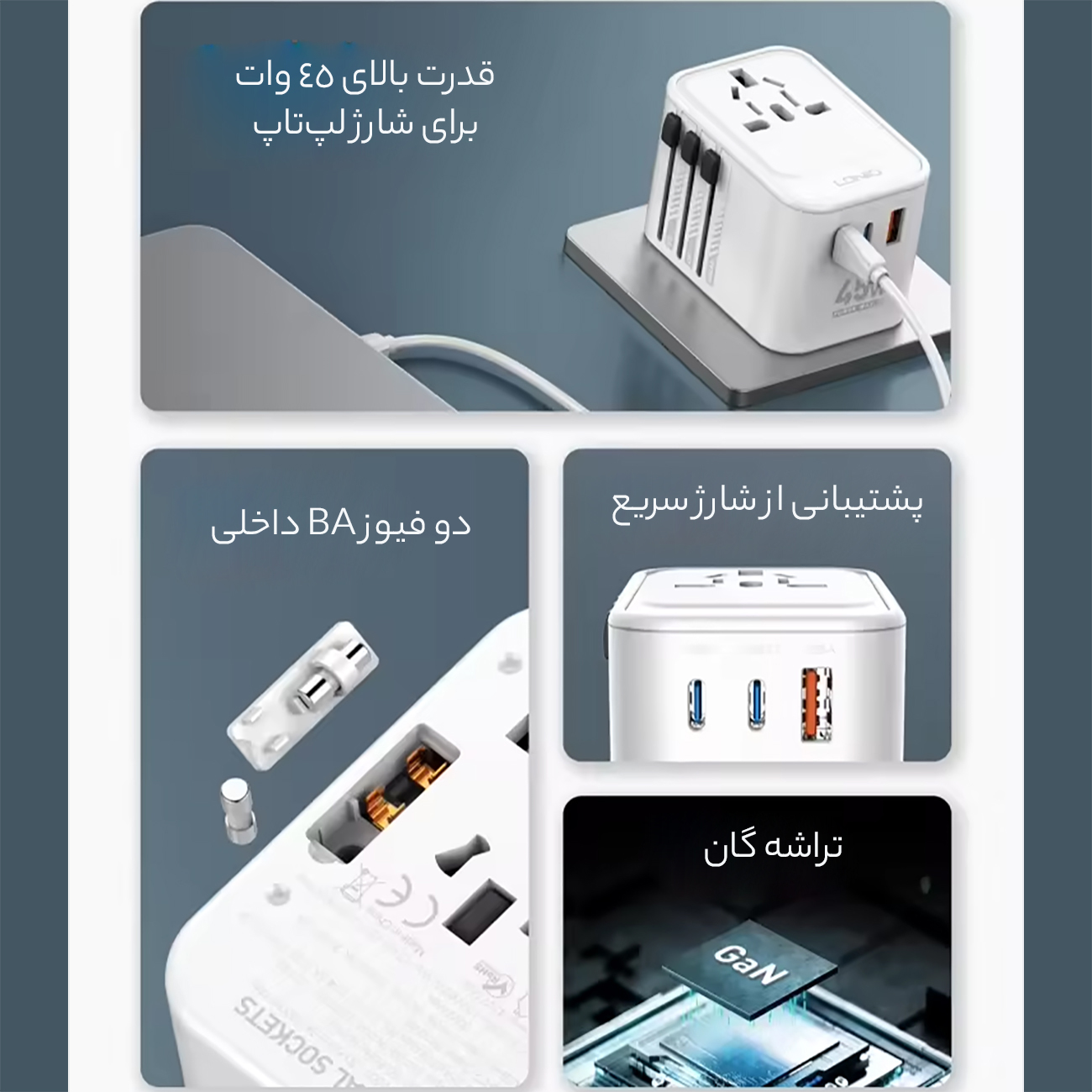 چندراهی برق 45 یک یو اس بی، دو تایپ سی و یک سوکت برق با دوشاخههای مختلف الدنیو Z8