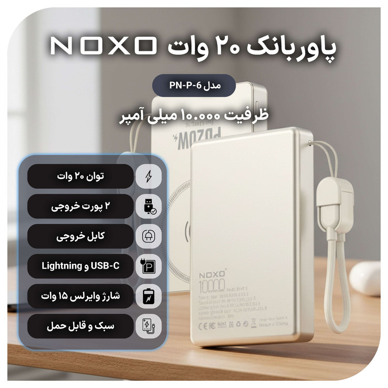 پاوربانک نوکسو مدل pn6 با ظرفیت 10000 میلی آمپرساعت، انتخابی مناسب برای افرادی است که به دنبال شارژی سریع، ایمن و قابل اعتماد هستند. این پاوربانک از فناوری Power Delivery 20 وات و شارژ بی سیم 15 وات پشتیبانی می کند و قادر است چند دستگاه را به صورت هم زمان شارژ کند. وجود پورتهای USB‑C و Lightning به همراه پد شارژ بی سیم روی بدنه، امکان شارژ انواع گوشی های هوشمند، هدفون های بی سیم و سایر گجت ها را چه با کابل و چه به صورت بی سیم فراهم می کند. تراشهٔ هوشمند داخلی شدت جریان را متناسب با نوع دستگاه تنظیم می کند تا سرعت شارژ بهینه و دمای عملکرد کنترل شود. بدنه از پلاستیک فشردهٔ ABS+PC ساخته شده است که در برابر ضربه و حرارت مقاومت بالایی دارد. وزن سبک و ابعاد فشرده باعث می شود این پاوربانک به راحتی در کیف یا جیب قرار گیرد و برای استفاده در خانه، محل کار یا سفر گزینه ای مناسب باشد. همچنین، سیستم حفاظت چند مرحله ای این مدل، دستگاه را در برابر نوسانات حرارت، ولتاژ و جریان بیشازحد ایمن نگه میدارد. با پاوربانک نوکسو pn6 می توانید در هر شرایطی شارژی پایدار، سریع و مطمئن را تجربه کنید.